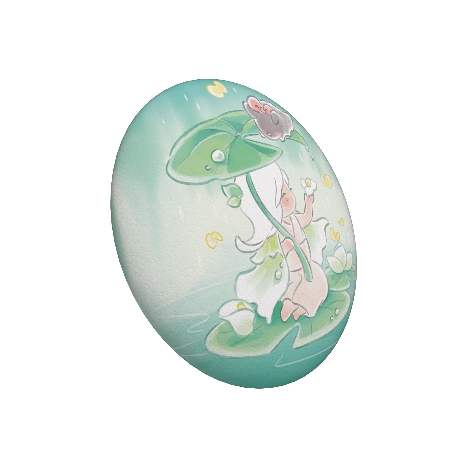 雨音に耳を澄ませ、睡蓮の葉に静かに囁くひととき。和紙素材に繊細な水彩デザインを施した缶バッジです。花笑むアルムの花びらケープをまとった星の子どもが、睡蓮の葉に落ちる雨を穏やかに眺める情景を描いています。雨音を聞きながら過ごす時間のような、心安らぐひとときに寄り添います。