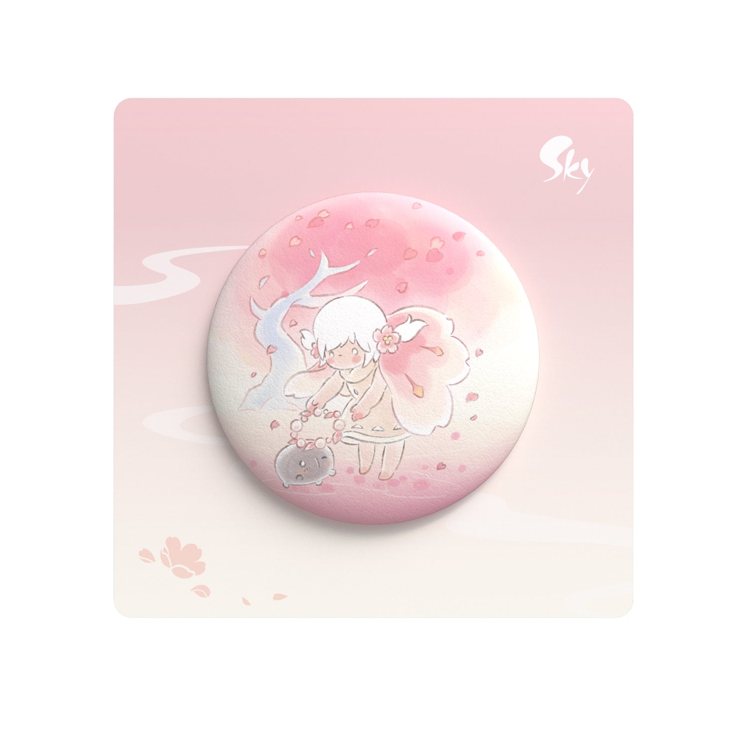 やさしい風、心温まるひととき。和紙素材に繊細な水彩デザインを施した缶バッジです。花笑むピンクのケープを着た星の子どもが、木の下で闇の蟹にそっと花冠を乗せる、心温まるひとときを描いています。お洋服やバッグに添えて、やさしい気持ちをそっと運びます。