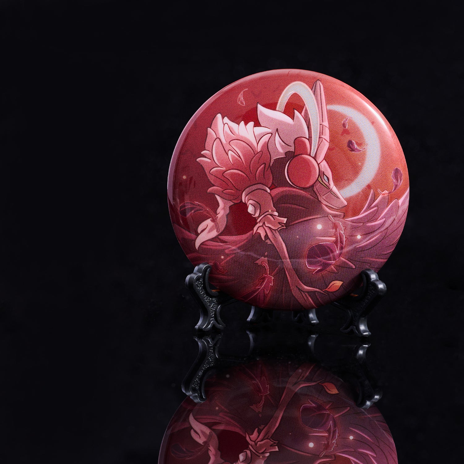 この缶バッジは、いたずらな日々の衣装のデザイン要素を取り入れました。カメラのフラッシュを受けると、背景にきらめくラメが現れ、闇夜を眩しく照らす星明かりのように輝きます。普段は静かに上品さを漂わせ、光を浴びた瞬間、華やかな輝きが舞い踊ります。