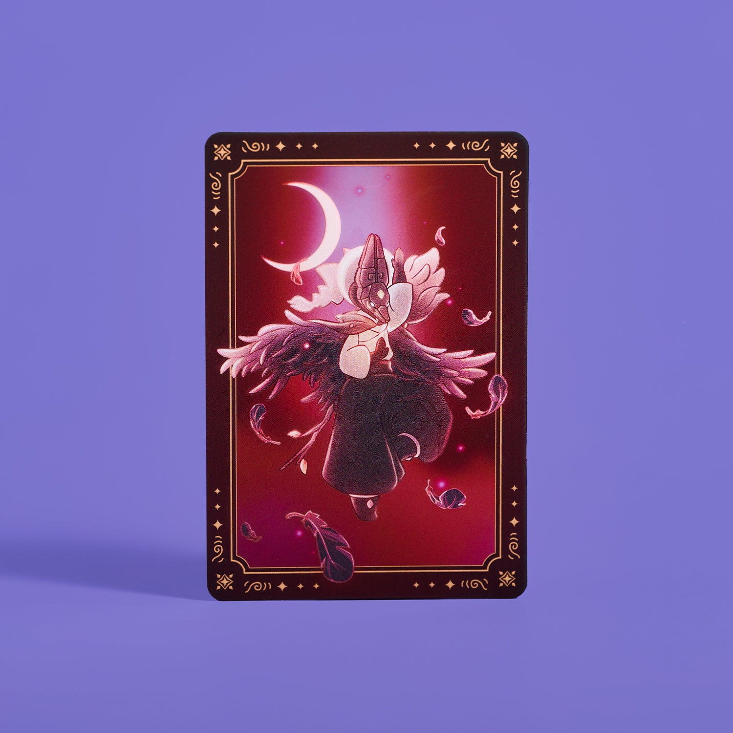 いたずらな日々の衣装をあしらったコレクションカードは、虹色の光を放つPET加工で仕上げられています。光が表面を踊り、角度によって表情を変え、輝く夜の光を表現します。